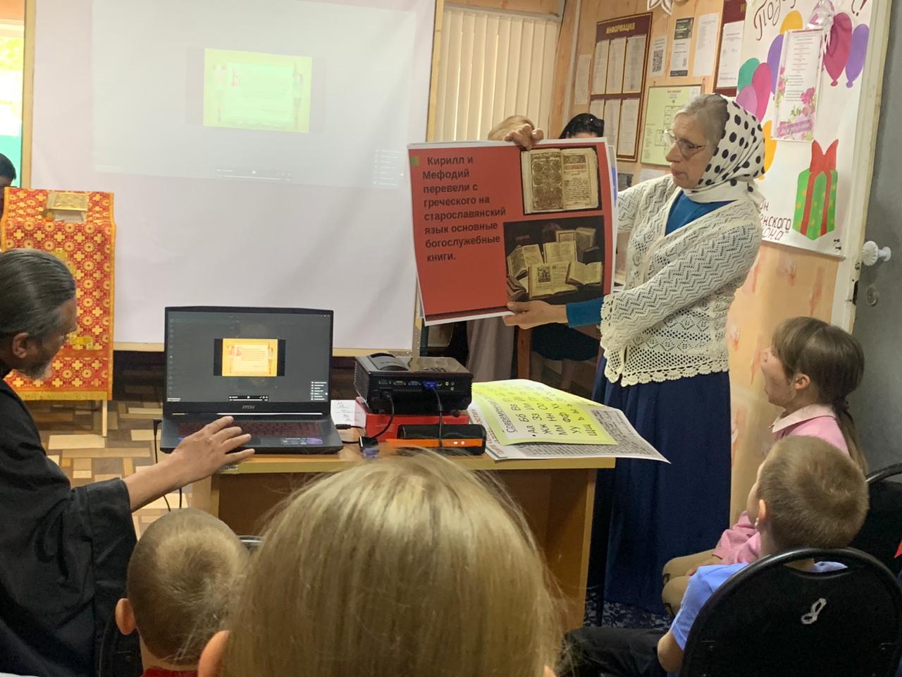Батюшка Стефан и матушка Инна рассказали присутствующим о происхождении братьев Кирилла и Мефодия. Кирилл с малых лет проявил большие способности и в совершенстве постиг все науки своего времени, а также изучил многие языки, на основе греческого создал славянскую азбуку. Он существенно изменил греческую азбуку, чтобы более точно передать славянскую звуковую систему. Новый алфавит получил название «кириллица» по имени одного из братьев, Константина, который, приняв монашество, стал Кириллом. А помогал ему в богоугодном деле образования славянских народов старший брат Мефодий.