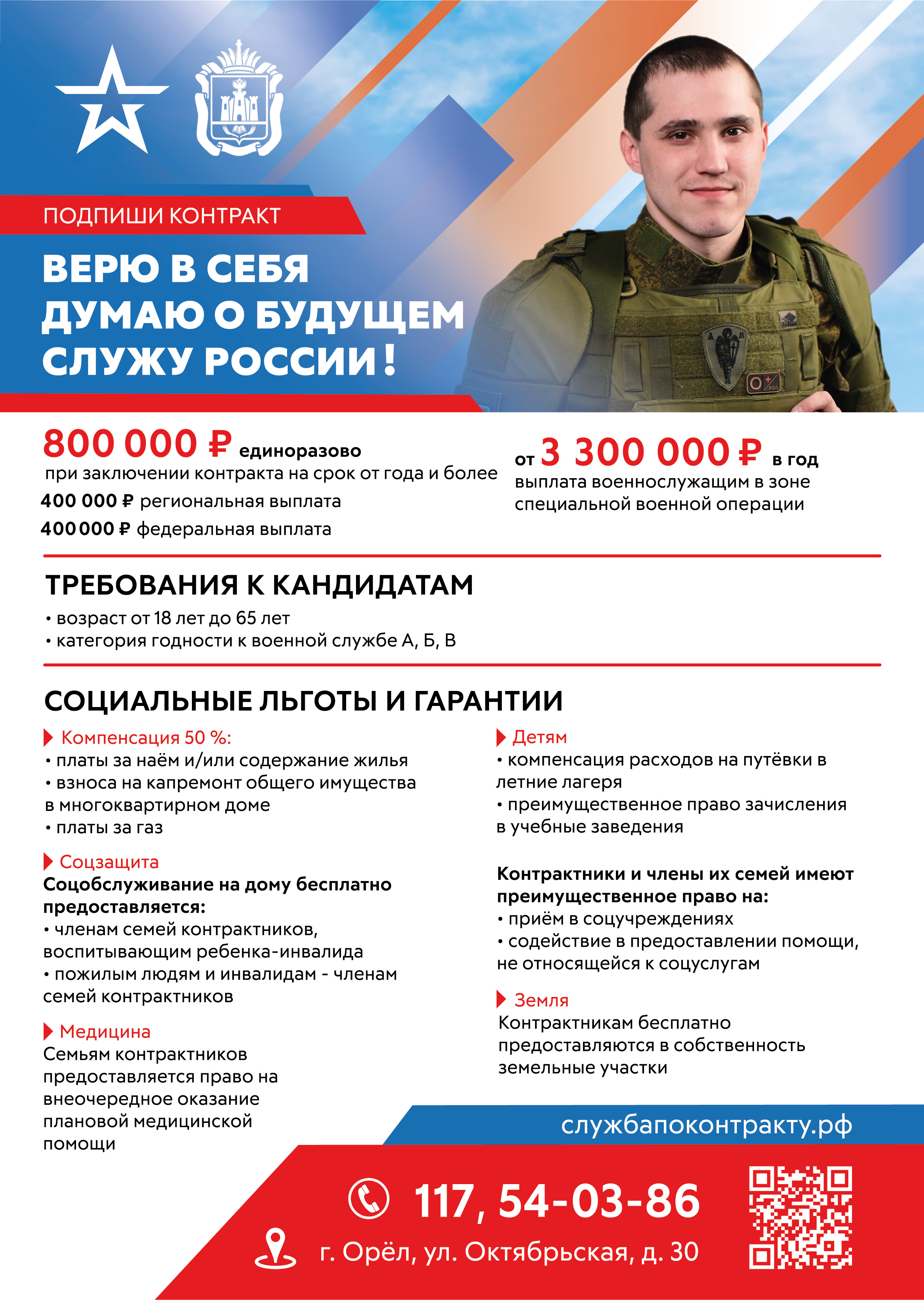 "Президент России принял решение увеличить выплату военнослужащим по контракту до 400 тысяч рублей. Выплату такого же размера мы устанавливаем на региональном уровне. Теперь любой военнослужащий-орловец при заключении контракта единовременно получит 800 тысяч рублей", - сообщил глава региона.