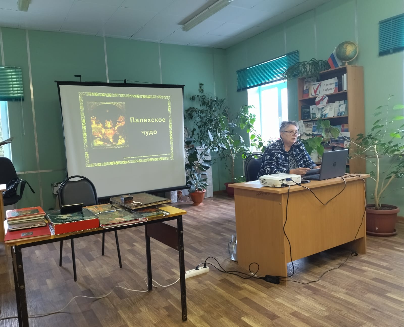 Сегодня на базе Межпоселенческой центральной библиотеки Знаменского района состоялась встреча с библиотекарями "Орловской областной научной универсальная публичной библиотеки имени И.А. Бунина". Специалисты отдела основного книгохранения Ольга Юрьевна Краузова и Наталья Владиленовна Борзенкова провели для присутствующих арт-час «Палехское чудо».