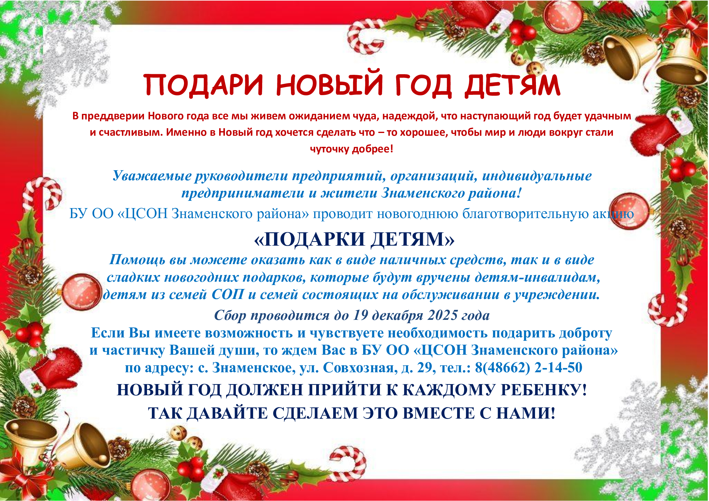 БУ ОО "ЦСОН Знаменского района" проводит новогоднюю благотворительную акцию «ПОДАРКИ ДЕТЯМ».