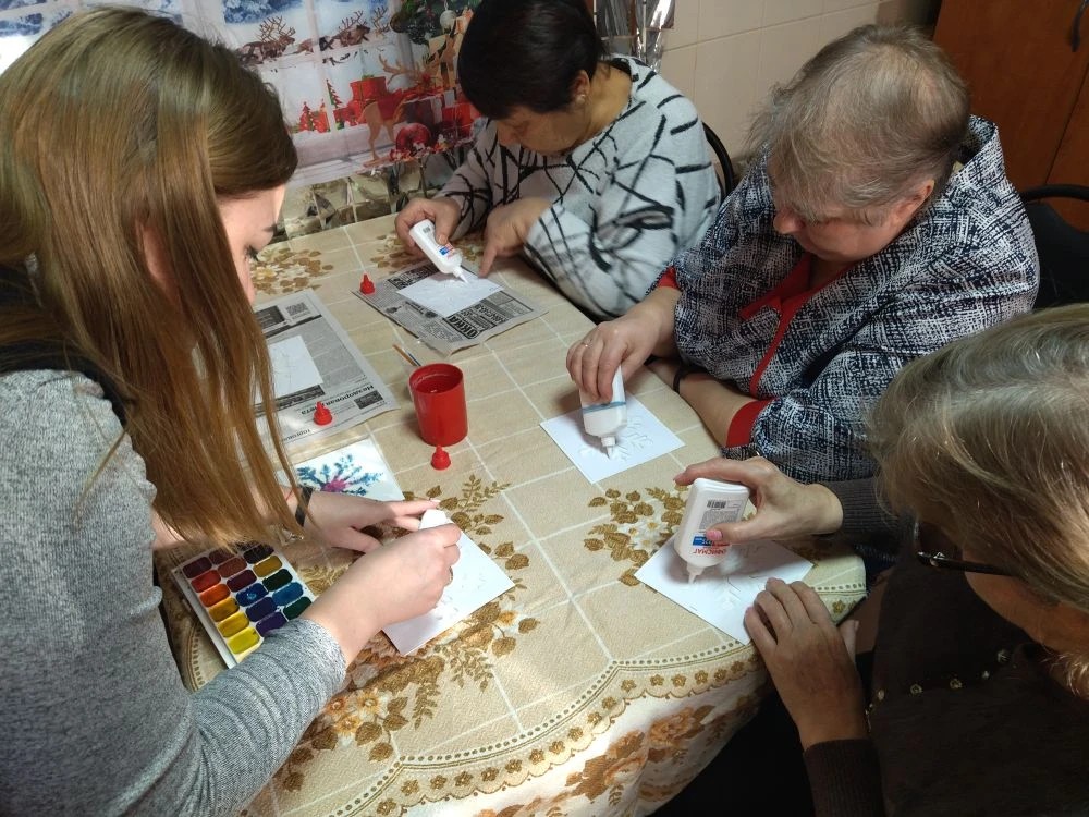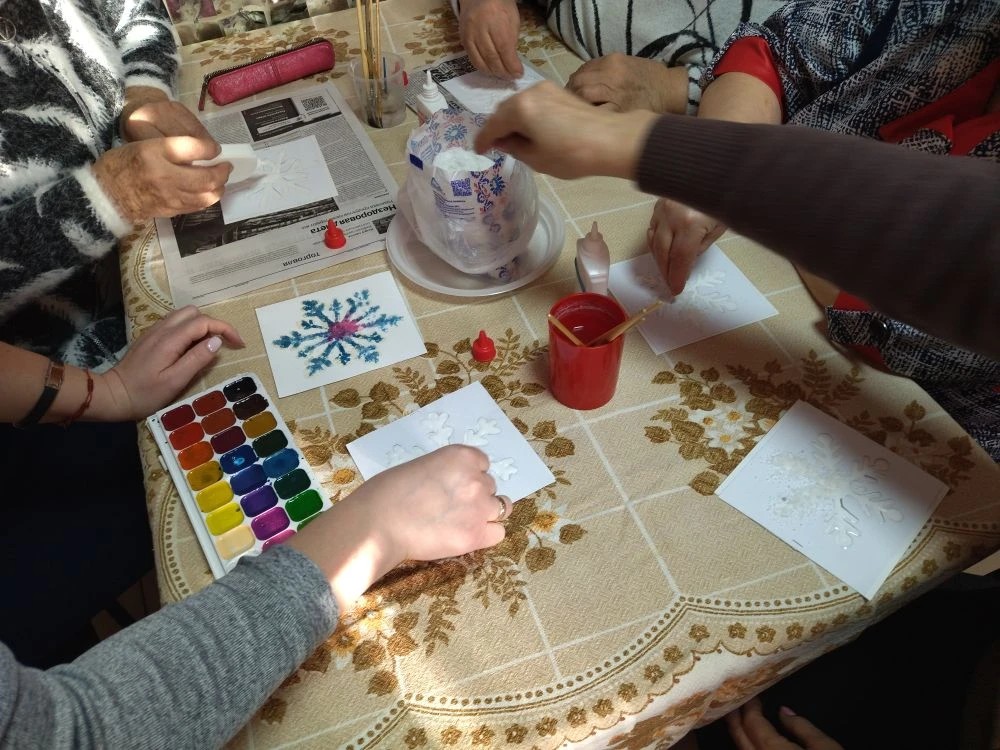 Наши замечательные участники, люди старшего возраста, с энтузиазмом взялись за дело. Сначала мы наносили на бумагу клей ПВА затем, щедро посыпали ее мелкой солью и далее раскрашивали акварельными красками, создавая фон – нежные голубые, синие, фиолетовые оттенки, словно зимнее небо. И тут началось настоящее волшебство! Соль начала впитывать влагу, и на наших глазах стали появляться удивительные, неповторимые узоры. Каждый мазок кисти, каждое движение руки создавало уникальную снежинку, не похожую на другие. Мы наблюдали, как соль "рисует" сама, создавая тонкие, изящные линии и мерцающие кристаллики.