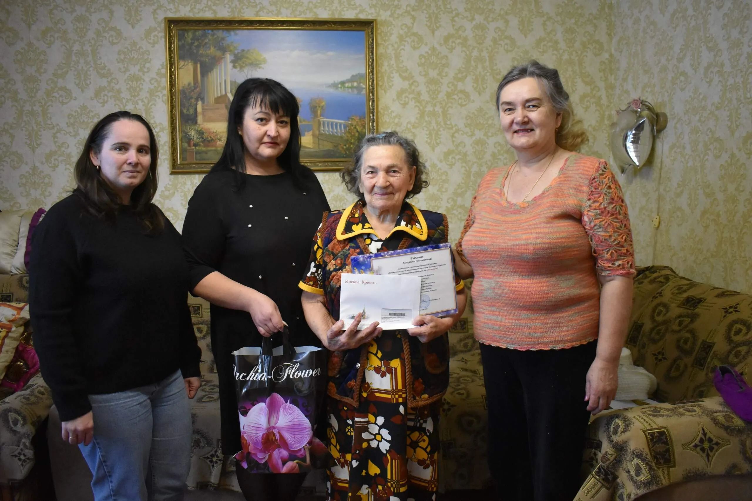 В этот день именинницу поздравила директор Центра социального обслуживания населения Знаменского района Наталья Владимировна Кинаревская, вручила ей персональное поздравление Президента РФ Владимира Владимировича Путина, поздравительную открытку и подарок от Центра социального обслуживания населения.