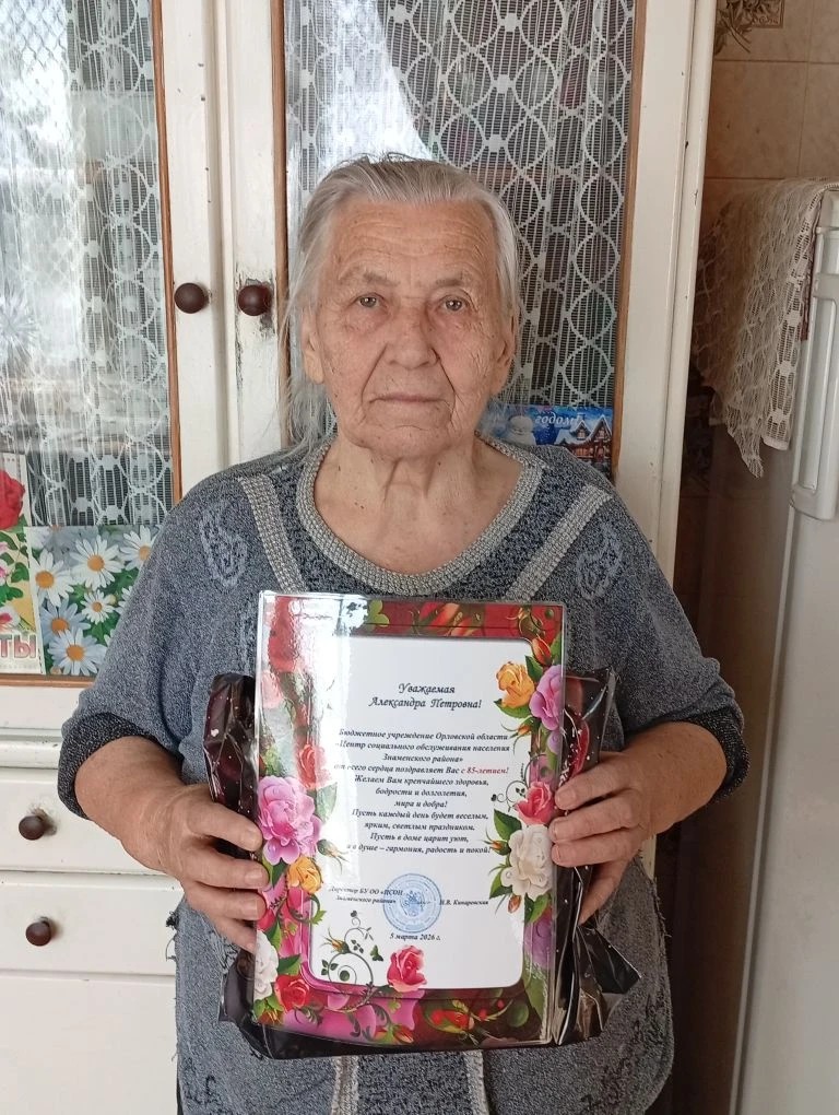 В рамках проекта "В Дом с добром" специалисты Центра поздравили Александру Петровну с прекрасной датой и вручили ей поздравительную открытку от директора Кинаревской Н.В. и памятный подарок.