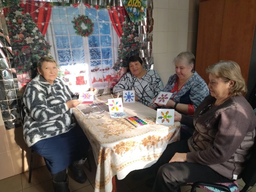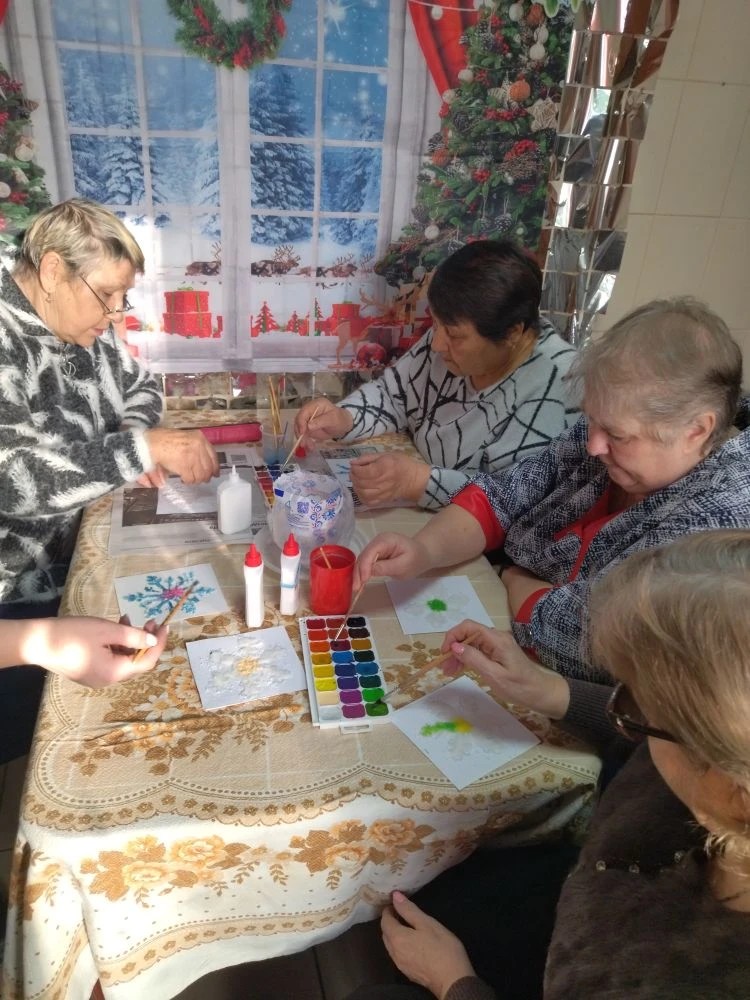 Наши замечательные участники, люди старшего возраста, с энтузиазмом взялись за дело. Сначала мы наносили на бумагу клей ПВА затем, щедро посыпали ее мелкой солью и далее раскрашивали акварельными красками, создавая фон – нежные голубые, синие, фиолетовые оттенки, словно зимнее небо. И тут началось настоящее волшебство! Соль начала впитывать влагу, и на наших глазах стали появляться удивительные, неповторимые узоры. Каждый мазок кисти, каждое движение руки создавало уникальную снежинку, не похожую на другие. Мы наблюдали, как соль "рисует" сама, создавая тонкие, изящные линии и мерцающие кристаллики.