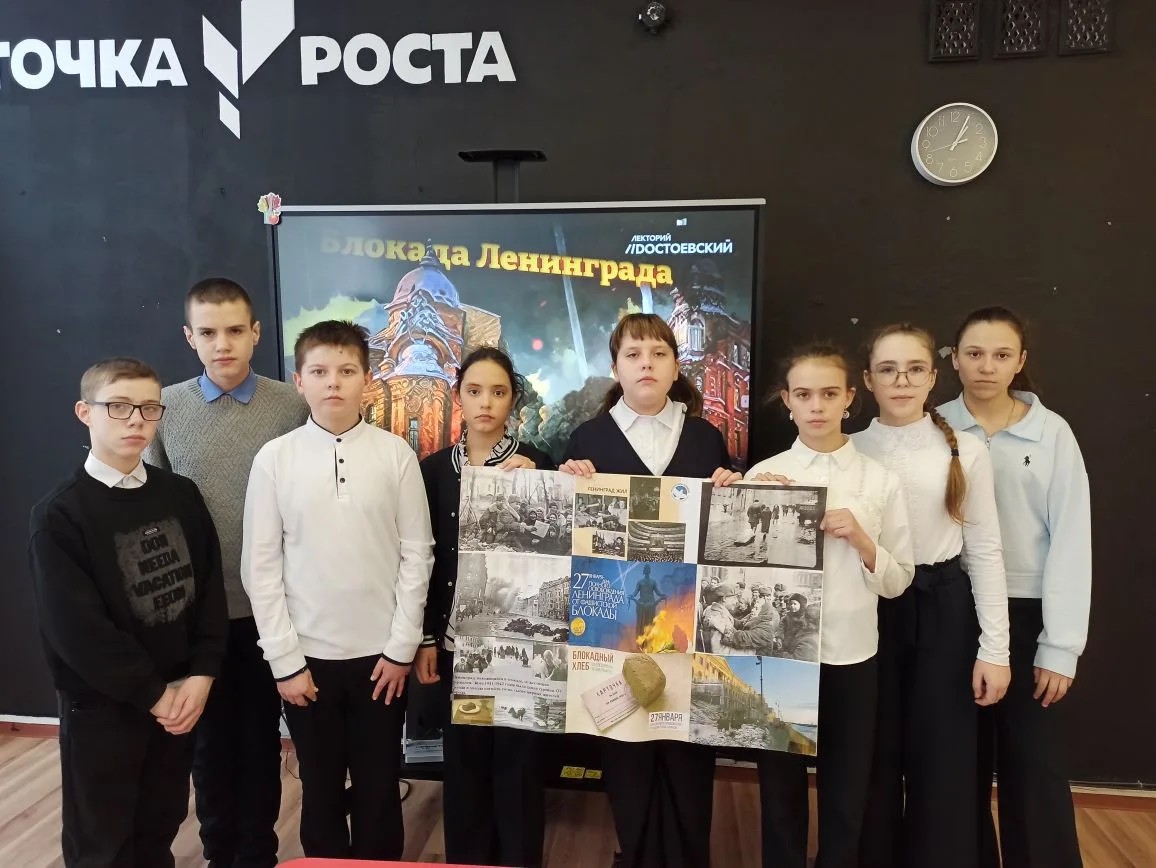 Ребятам было предложено посмотреть видео «Блокадный Ленинград», из которого они узнали о тяжелых испытаниях, выпавших на долю жителей блокадного Ленинграда, о голоде и холоде, о детях и женщинах, которые работали наравне с мужчинами на заводах, постоянных бомбёжках. Большое впечатление произвел рассказ о дневнике одиннадцатилетней школьницы Тани Савичевой, норме хлеба блокадников. Много было сказано о «Дороге жизни», которая помогала людям продержаться во время блокады.