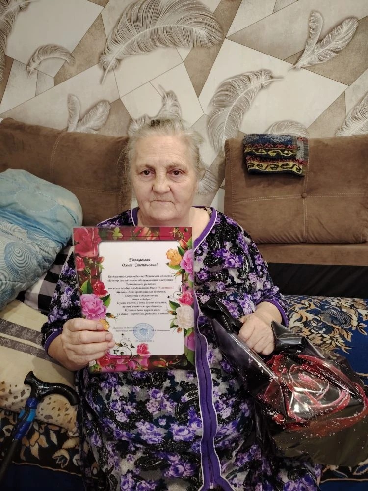 В рамках проекта "В Дом с добром" специалисты Центра поздравили Ольгу Степановну с прекрасной датой и вручили ей поздравительную открытку от директора Кинаревской Н.В. и памятный подарок.